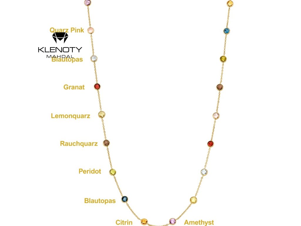 Náhrdelník s barevnými kameny - topazy, citríny, peridoty, ametysty a růžový křemen -duhová kombinace barev, která Vás jen tak neomrzí. Náhrdelník podtrhne Váš outfit a zaujme na první pohled. Díky délce 90 cm lze náhrdelník nosit dlouhý až do dekoltu nebo na dvakrát jako plnější ozdobu.